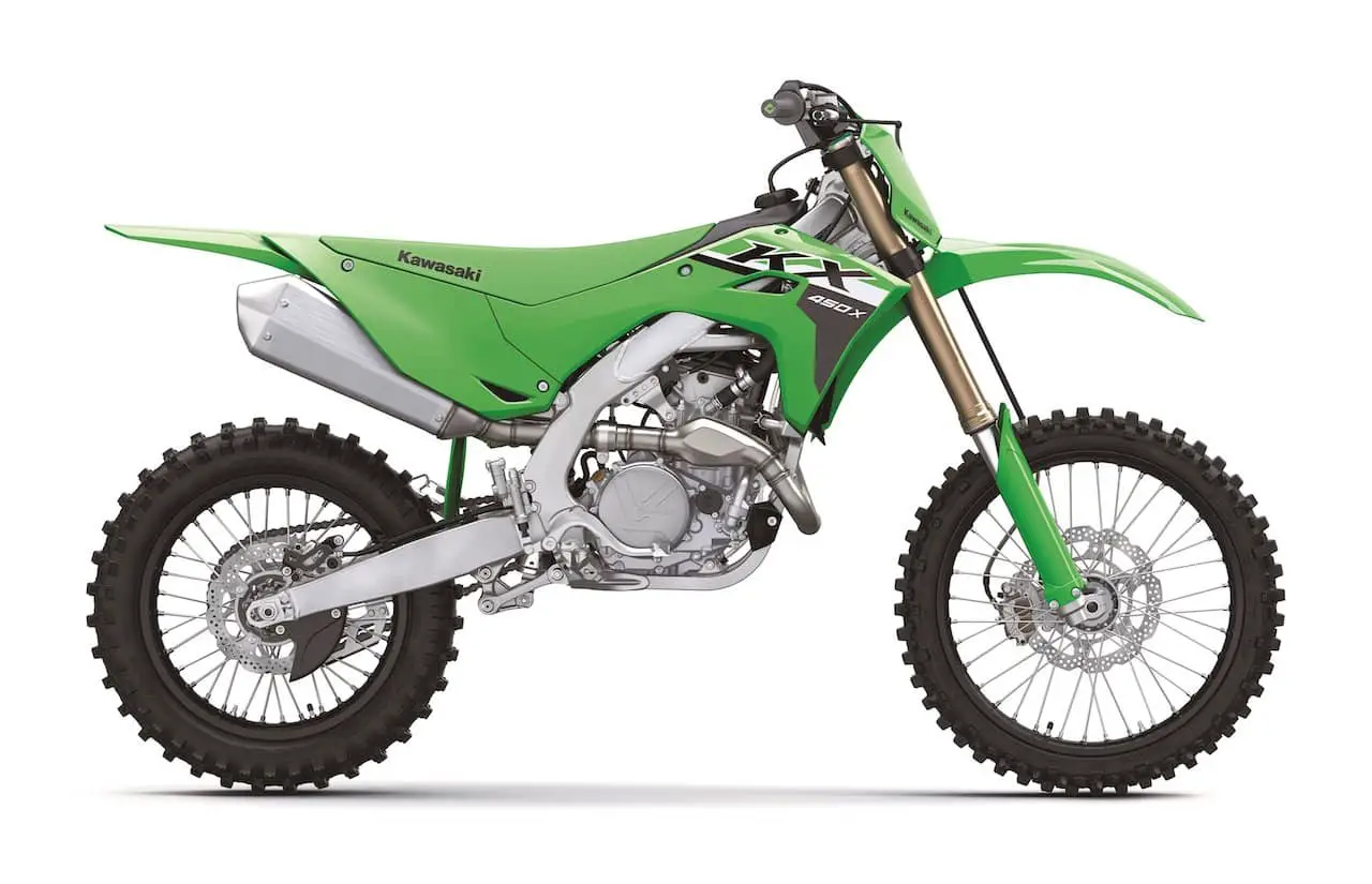 Zlepšená ovladatelnost a precizní ovládání jsou rovněž klíčovými pilíři nové KX450. Přední část motocyklu nabízí jezdcům lepší kontakt s terénem, což se projevuje v podmanivějším ovládání v zatáčkách. Agresivní zelená kapotáž nejen dodává motocyklu špičkový vzhled, ale také optimalizovanou ergonomii pro jezdce.