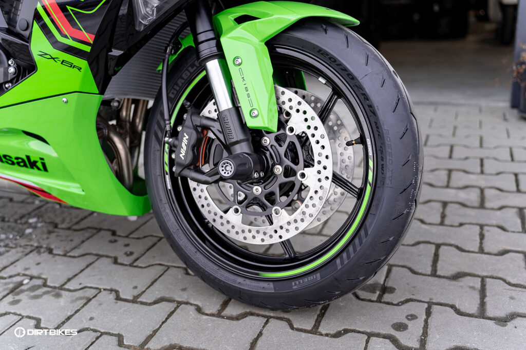 Agresivní 3D kapotáž s integrovaným přítlačným křídlem a krátkým plexisklem tlumícím turbulence spolu s aerodynamickou podsedlovou kapotáž vypadá naprosto famózně. O perfektní brzdný účinek se postarají monoblokové radiální brzdové třmeny a kotouče o průměru 310mm.